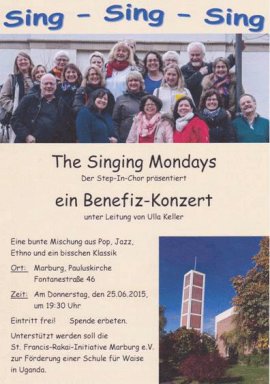 Liebe Gesangsbegeisterte, wir möchten Euch alle herzlich zu diesem besonderen Konzert einladen! Der gesamte Erlös der Konzert-Spenden, um die wir euch bitten möchten, geht an die St. Francis-Rakai-Initiative Marburg ev. Ein tolles Projekt, das wir gerne unterstützen.