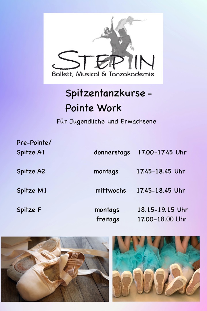 Zur optimalen Vorbereitung bieten wir ab 11 Jahren eine spezielle Pre-Pointe Stunde an. Hier wird an besonderen Kraft und Beweglichkeitsübungen gearbeitet, sowie das Ballettvokabular erweitert.